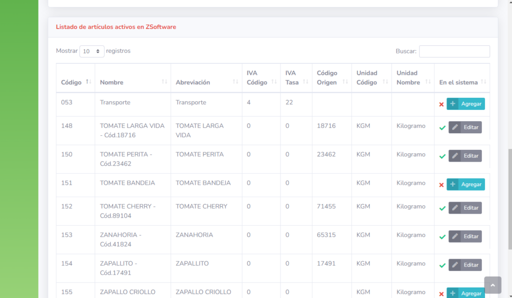 En la última columna están las opciones de agregar y editar, dependiendo si dicho artículo ya está en el sistema de Frutas del Plata o no.