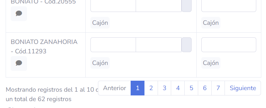 Al pié de una tabla se ven la cantidad de resultados obtenidos y la paginación local de resultados. En el siguente ejemplo se ven 7 páginas de Verduras:
