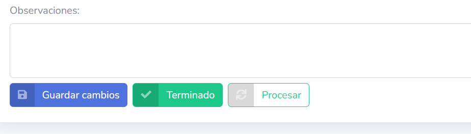 Al final de la pantalla de edición del pedido verá la casilla de Observaciones y los botones para Guardar cambios, Terminado, y si tienes acceso para ello: Procesar.